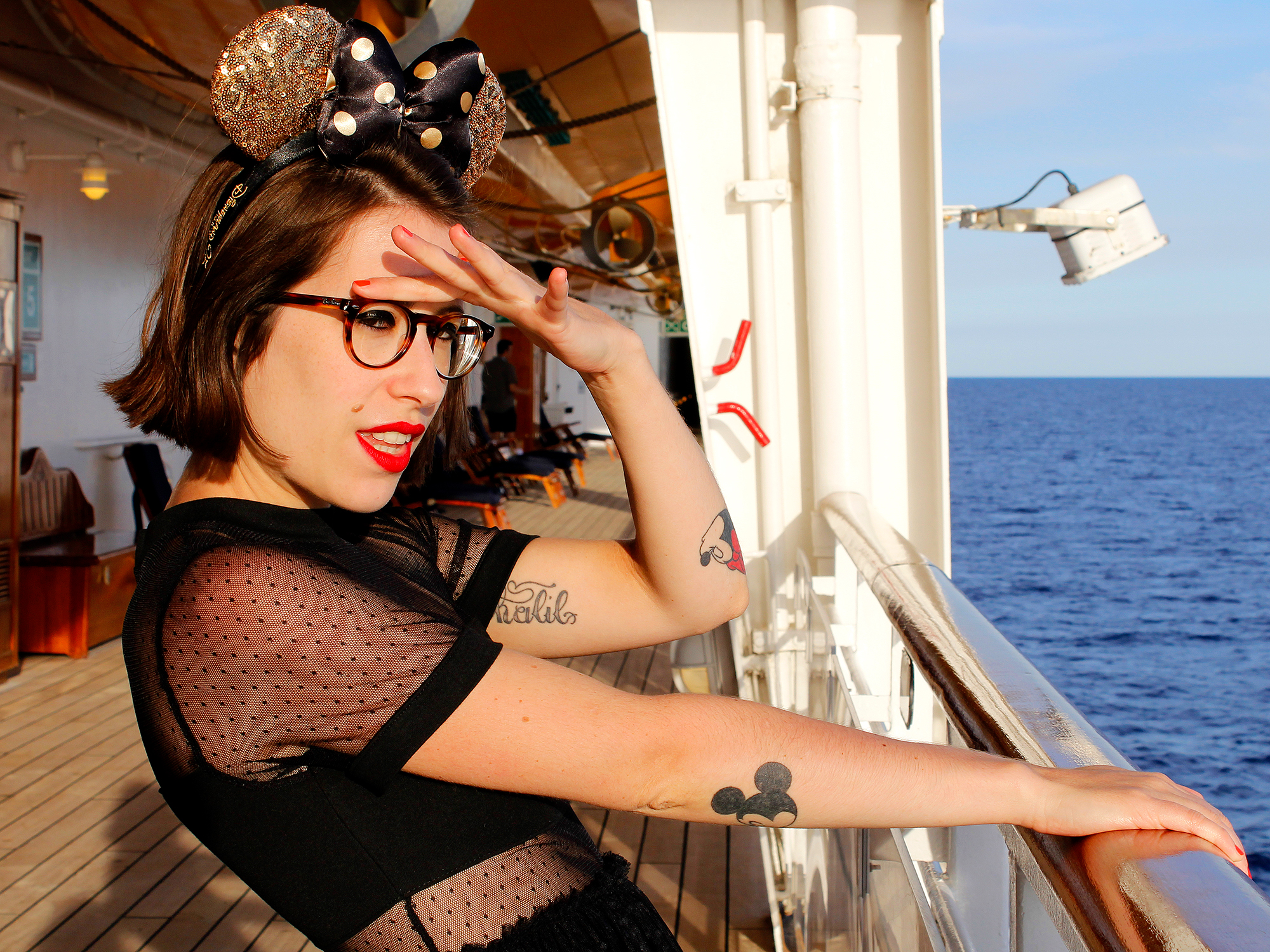 La « formal night » était bien ce soir-là, il n’y en aurait pas d’autre. Certes le dress code n’était pas obligatoire, mais pour nous cette soirée avait une importance toute particulière, et nous avions prévu robes et chaussures en conséquences. C’est le moral dans les chaussettes que nous avons posé avec Mickey, magnifique dans son costume de maître de cérémonie, dégoûtées d’avoir raté ce grand moment du voyage. Mais c’était sans compter sur ma réactivité et ma détermination à redonner le sourire à Zouzou ! Ni une ni deux, nous avons foncé dans notre cabine pour un changement de tenue express et une séance de maquillage. Une fois pomponnées nous avons repris la tournée des personnages, et avons même improvisé une séance photos avec vue sur la mer autour du Deck 4.