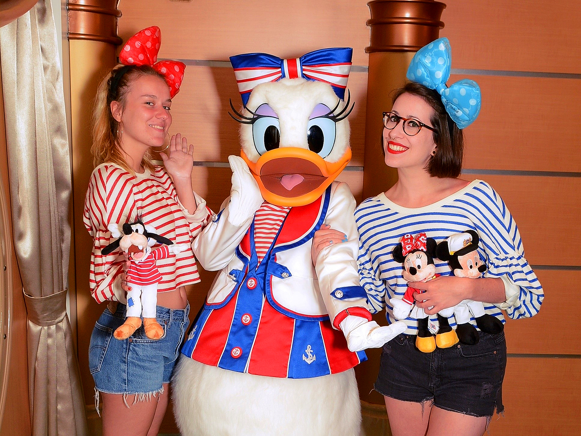 Jour 3 : Après nos péripéties culinaires puis aquatiques, Zouzou et moi sommes allées nous changer dans notre chère petite cabine, en prévision de la session photos de l’après-midi. Parmi les nombreuses tenues que nous avions préparées (ai-je précisé qu’on a du dédier une demi-valise à nos serre-têtes oreilles de Minnie ? Ooops !) nous avons choisi pour cette après-midi de porter nos marinières, et de les accessoiriser avec nos peluches achetées le premier soir. Et bien nous avons eu le nez très fin (surtout Zouzou) puisque c’est justement ce jour-là que la bande à Mickey a choisi pour sortir en habits nautiques ! Zouzou me soutient que c’était logique, mais ça ne l’a pas été tous les jours, en tout cas ça rattrapait le coup de notre quasi-ratage de formal night ! Nous avons donc profité de ce drôle de hasard pour prendre des photos avec tous les personnages présents. Pendant les (très courtes) files d’attentes nous avons papoté chiffons avec les ADORABLES CM accompagnatrices, qui se sont amusées jour après jour à détailler nos tenues assorties (insérer emoji fier avec lunettes de soleil). Ce fut un de nos meilleurs moments photos pour sûr !