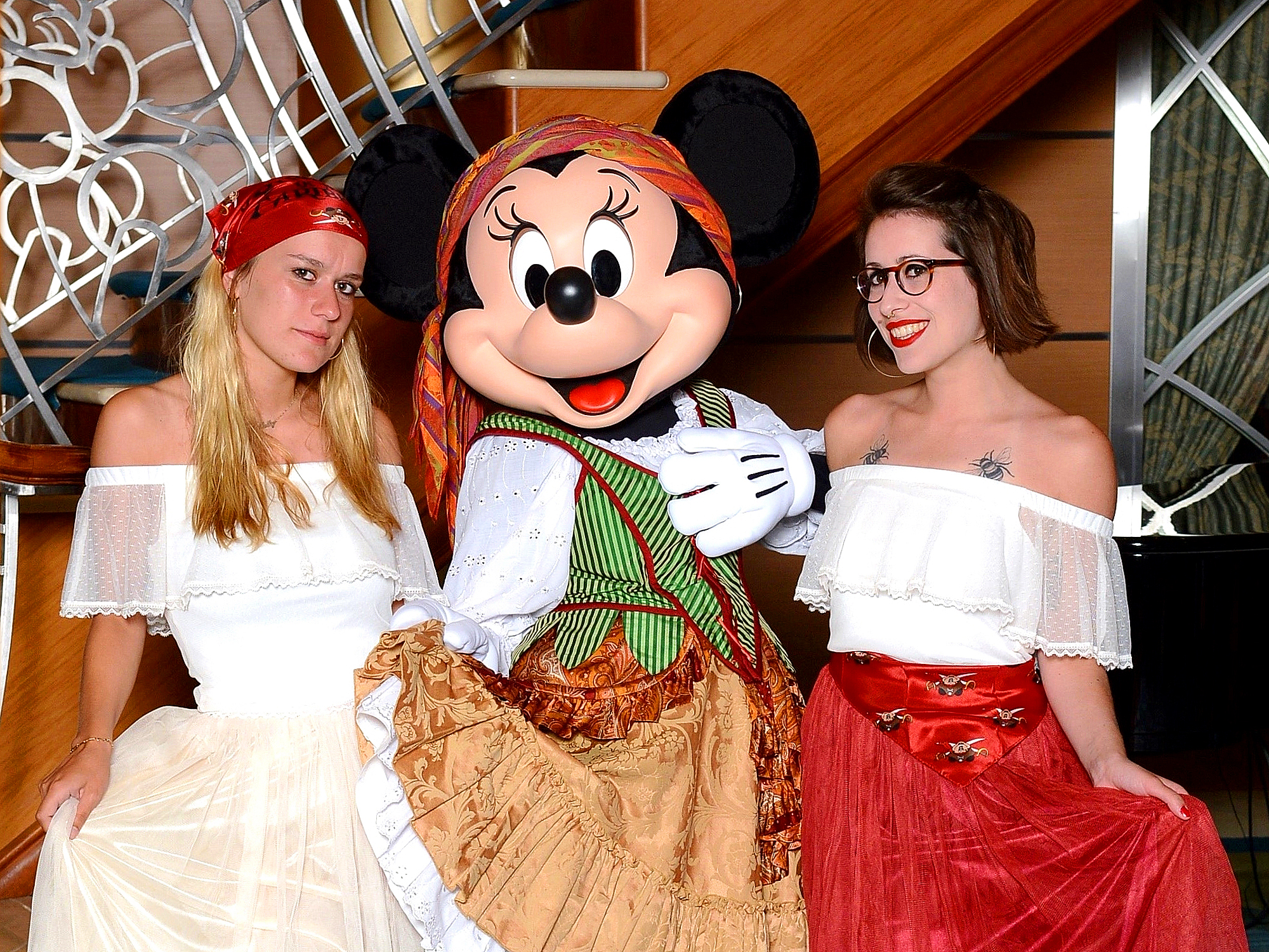 Les Meet and Greets de la soirée pirates furent clairement un des meilleurs moments du voyage. Plus que n’importe quel autre jour les personnages étaient parfaits dans leurs rôles, des décors avaient été installés pour renforcer l’ambiance, et la quasi-totalité des guests était costumée ou habillée dans le thème pirate ! Une atmosphère détendue et légère régnait sur le Magic, même les CM avaient l’air de bien s’amuser voyant que chacun prenait un tel plaisir à rentrer dans le game. Comme d’habitude nous avons été complimentées pour nos tenues assorties (simplicité et efficacité, rien à ajouter) et notre absence de chaussures ! Et ouais, les vrais boucaniers n’ont pas besoin de souliers pour danser sur le pont, marin d’eau douce ! Malgré la forte affluence sur le bateau lorsque nous avons commencé notre tournée de photolocations, nous avons très peu attendu pour rencontrer les personnages ! C’est Crochet et Mouche qui ouvraient le bal ce soir-là, parfait pour se mettre dans le bain ! Poser ainsi accoutrées avec la bande a Mickey a bien sûr été le point d’orgue de cette très longue séance photo. Nous avions même emporté les Tsum Tsum pirates de nos personnages chouchous pour parfaire l’accessoirisation de nos déguisements, rendant Mickey, Minnie, et Dingo très fiers d’avoir la première place dans nos coeurs (et nos collections cela va sans dire) !