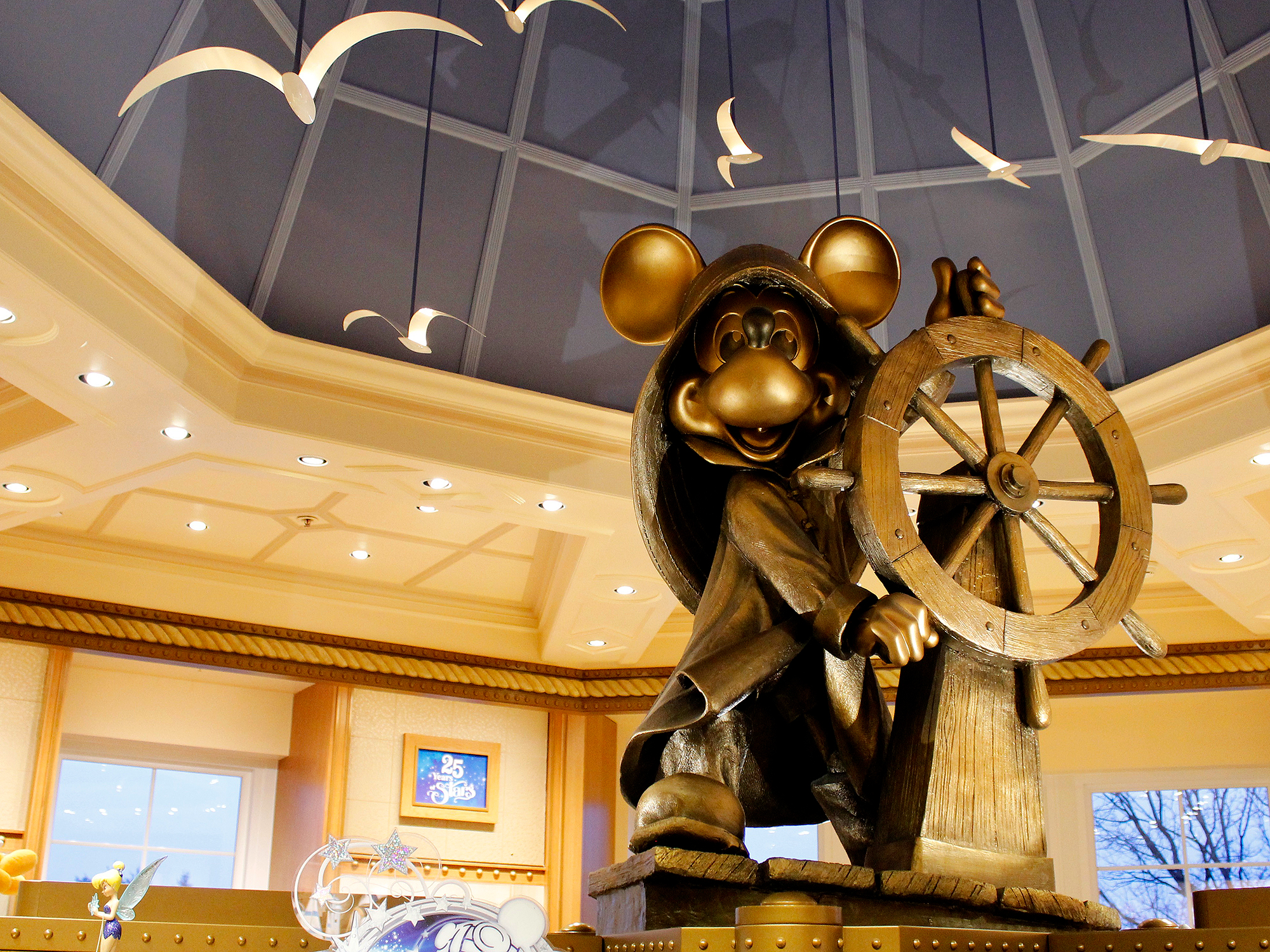 La météo n’étant pas meilleure après notre petit défilé de mode, nous avons renoncé à retourner au parc. A la place nous avons décidé de faire un tour à la boutique de l’hôtel puis d’aller prendre des boissons au Compass Club, histoire de boire un petit apéro toutes les trois dans la chambre avant de retrouver nos amis PE et Jessica pour le dîner. J’avais vraiment hâte de visiter la boutique car elle est décorée de la même statue de Mickey capitaine de navire que le lobby du Magic. Je trouve ce détail génial et j’ai adoré retrouver cette statue (je suis toujours aussi dégoutée de n’avoir pas trouvé sa réplique miniature sur le bateau, la prochaine fois peut être !) La boutique du Newport Bay Club est partiellement thématisée, comme la plupart des boutiques des parcs. On y trouve une partie de la gamme 25ème anniversaire, la collection de vêtements Minnie Mouse Parisienne, les classiques carnets d’autographe, et pour la touche maritime un rayon dédié à Moana.