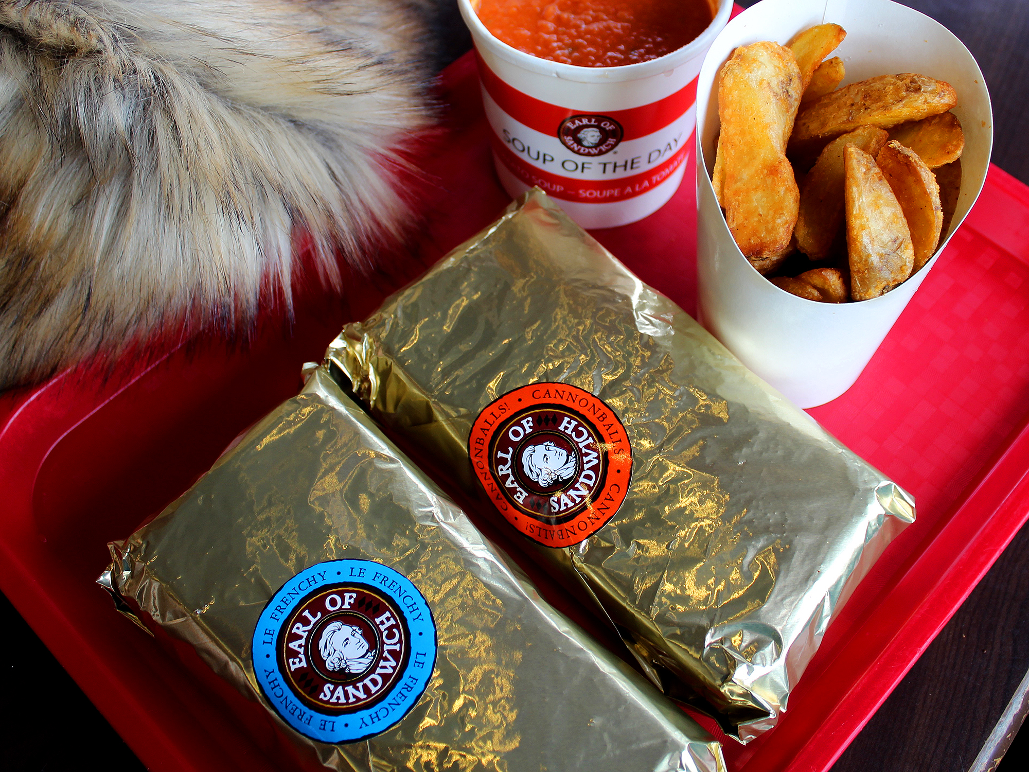 Peu avant midi, nous avons entassé nos bagages dans la voiture des Pejat, avons remis notre clé et nos fiches dûment remplies à la réception, puis nous avons rejoint la piscine pour près de deux heures de glissades et plongeons. Il y avait beaucoup plus de monde que la veille, mais cela ne nous a en rien empêchés de profiter de la Blue Springs Pool. Par chance, les jets avaient été remis en marche, il ne manquait que le jacuzzi pour que cette seconde visite soit parfaite. Epuisés et affamés, nous sommes finalement sortis de l’eau vers 14h. Une fois séchés, habillés, et bien sûr après avoir enfilé nos désormais célèbres toques, nous avons pris place dans la (très spacieuse voiture) des Pejat. Nous avons rejoint le parc Disneyland au son de la chanson d’anniversaire de Mickey et Minnie, « It’s a good time », il va sans dire à fond les ballons (la musique, pas l’auto évidemment). Contre toute attente, un grand soleil nous a accueillis sur le parking Infinity. La première étape de notre après-midi sur les parcs fut le restaurant Earl of Sandwich à Disney Village, pour un déjeuner bien mérité. Zouzou et moi avons choisi de partager un Cannonballs et un Frenchy, avec un cornet de potatoes. Nous avons accompagné nos sandwichs de soupe et ce fut une très bonne surprise. La vue sur le lac et Panoramagique est toujours un plus, particulièrement avec un si beau temps.