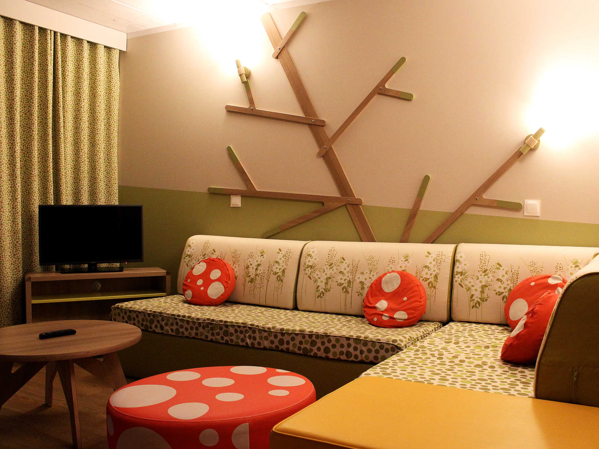En termes de surface et de distribution des pièces c’est vraiment l’endroit parfait pour un séjour entre copains. La déco plutôt kitsch doit sûrement ravir les bambins, mais a eu un effet mitigé sur les grands enfants que nous sommes. Son style assez naïf / cartoon sans une touche de Disney le rend un peu cheap. En gros, à ce stade du week-end, nous étions tout simplement contents de poser nos fesses et de partager un premier verre. Heureux d’avoir une cuisine bien équipée et de la place pour danser. Surexcités par l’arrivée imminente des Pejat. Et… trempés de la tête aux pieds par cette saleté d’averse. Action, réaction : Zouzou et moi avons chacune largué notre trousse de toilette dans une des salles de bains, pour prendre une douche chaude bien méritée, et éloigner le rhume galopant. A peine la porte des waters de l’étage refermée, on entendit Zouzou s’époumoner : « hé les meufs, c’est quoi ce b*rdel ?»