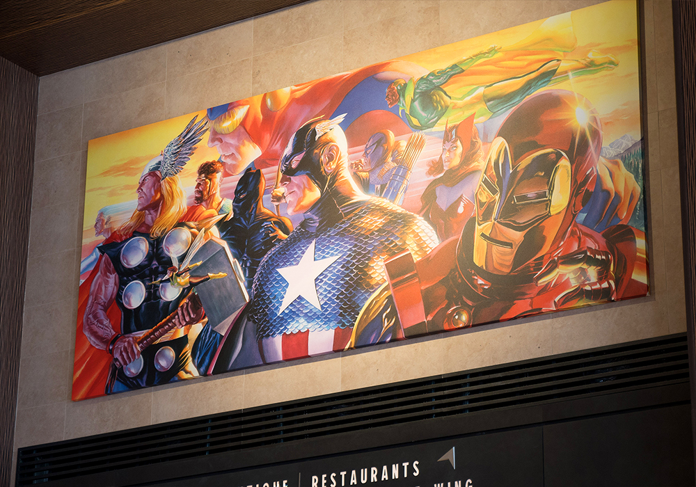 L’une de mes oeuvres préférées de l’hôtel est également un diptyque dessiné cette fois par l’artiste Alex Ross. Les deux peintures digitales « Avengers Assemble » et « Invincibles » se font face et nous présentent les Avengers avant et après leur mission. Tantôt le regard grave et plongé vers le visiteur, tantôt triomphants et volant vers de nouvelles aventures sur fond de soleil couchant (du moins ça y ressemble !). On retrouve sur le tableau « Invicible » les personnages de Quicksilver, Hercules, et Goliath qui ont rejoint les autres Avengers. (La seconde photo qui est également la couverture de ce billet est l’oeuvre de Flavou)