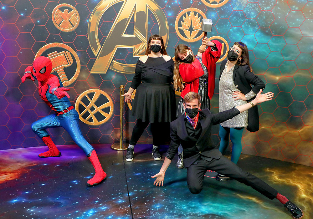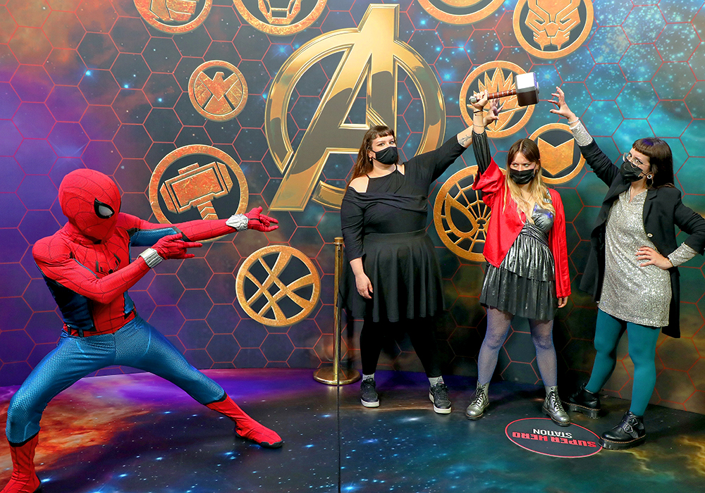 Notre activité suivante avait lieu à l’Hotel New York – The Art of Marvel (Hein ? Comment ça on a fait notre check-out et rendu notre chambre mais on continue à squatter l’hôtel comme des moules qui s’accrochent à leur rocher ? Oui tout à fait) puisque nous avions réservé un créneau aux Marvel Hero Photo Stations pour continuer à nous mettre en scène dans nos habits asgardiens (la perspective de revêtir des tenues d’humains était vraiment trop dure à supporter). Cette fois-ci, Thor, Loki, le Bifrost, et Hela sont allés se perdre dans le multiverse où ils ont vécu des aventures toujours plus farfelues comme vous pouvez le voir ci-dessous. J’avais déjà profité de ces photolocations le mois dernier et vraiment j’adore cet endroit. Les différents décors se prêtent tous à des poses plus drôles les unes que les autres, même si mes préférées restent celle avec Mjölnir et la cage du Collectionneur.