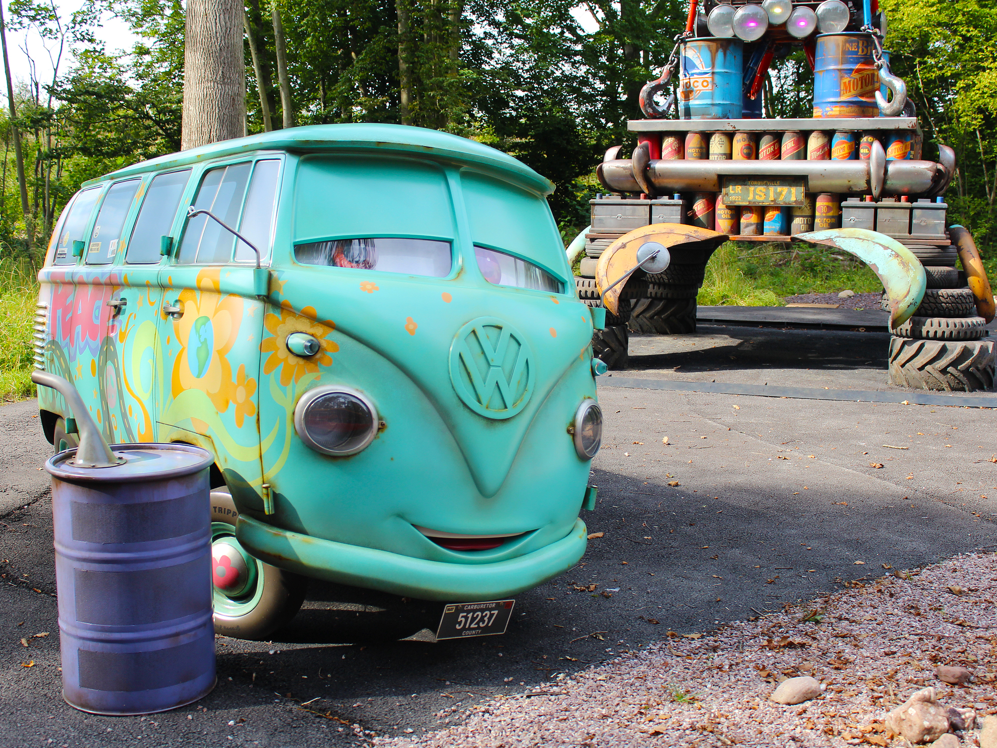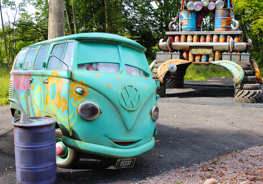 Nos pas nous ont ensuite entraînés sur la Route 66 pour rider l’attraction Cars Road Trip que toute la bande à l’exception de Bourdon découvrait pour la première fois. Ils avaient attendu que l’on rende visite aux Studios ensemble pour que je fasse la guide de l’attraction, la première sur laquelle j’ai eu le plaisir de travailler pendant près de trois ans. Pour compléter notre expérience de la franchise Cars, nous sommes allés déjeuner au food truck Laugh’N’Go de sandwichs Croc McQueen accompagnés de leurs Piston Cups de légumes. J’étais très fière de manger enfin sur une table que j’ai designée, bien entendu je me devais de prendre la pose avant de dégommer mon croque à la Vache qui rit.