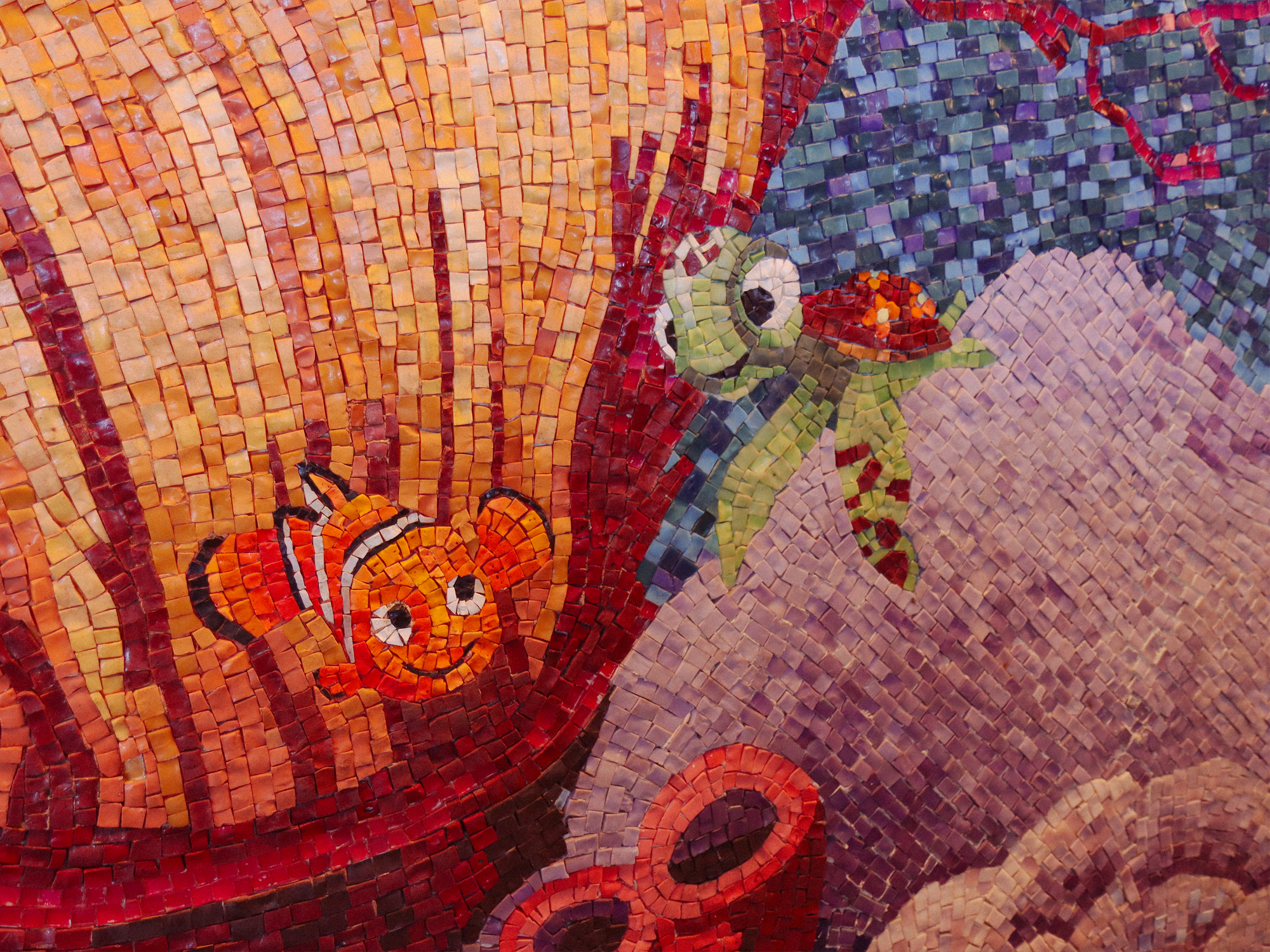 Une petite faim se faisant sentir au début de l’après-midi nous sommes retournées au Cabanas où nous avons eu le plaisir de découvrir des assiettes de sushis dans la sélection du déjeuner. Nous les avons accommodés d’une salade de falafels pour moi et de mac and cheese pour Zouzou (admirez au passage les magnifiques mosaïques et les fresques représentant les chateaux Disney en sable que l’on peut voir à l’intérieur du restaurant).