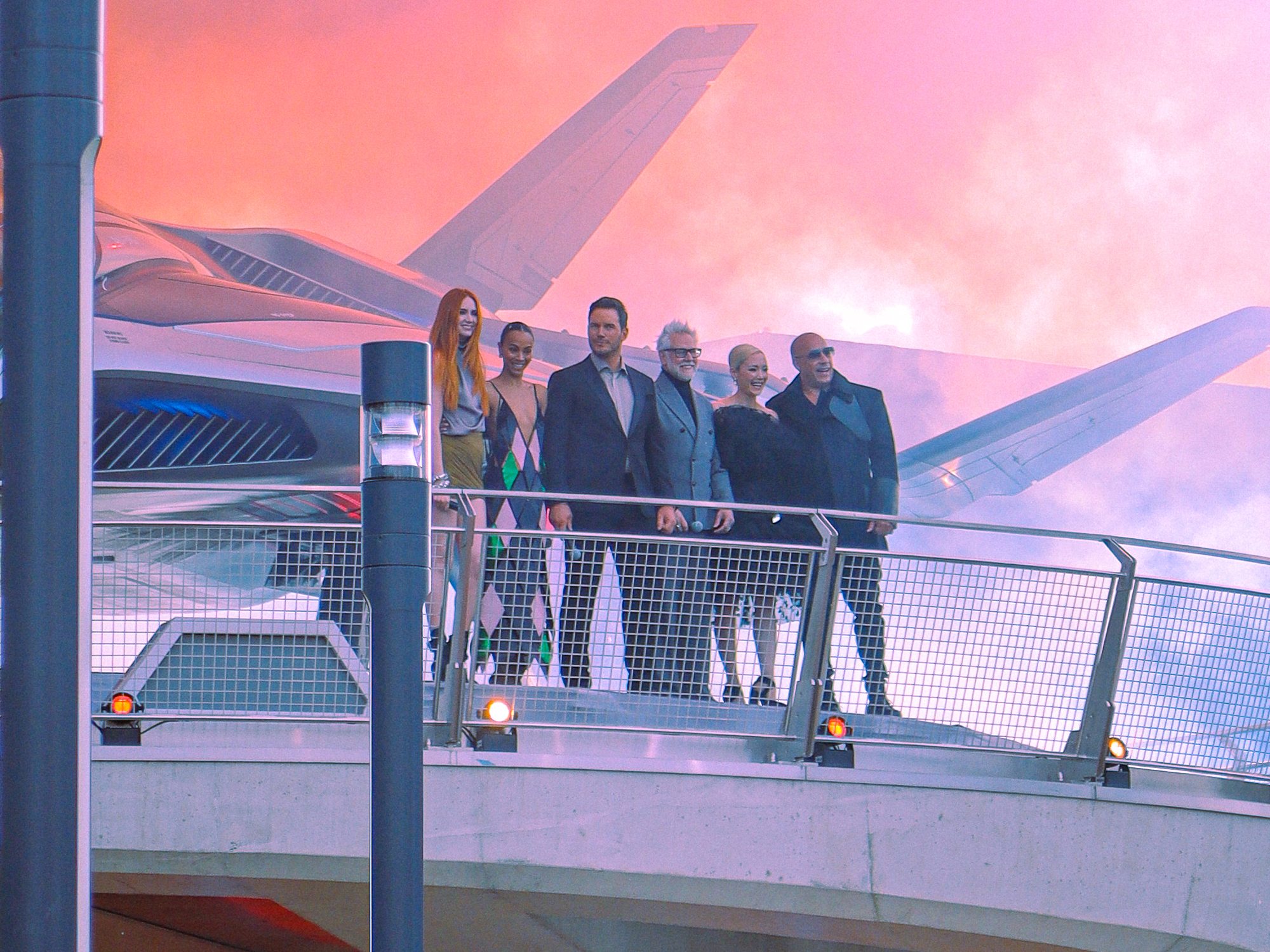 Après un bon moment passé à attendre notre impatience était à son comble ! Finalement, le silence s’est fait et la maitresse de cérémonie est apparue sur la plateforme du Quinjet, avant d’être rejointe par James Gunn, Chris Pratt, Zoe Saldaña, Karen Gillan, Pom Klementieff et Vin Diesel ! Bourdon, Diane et moi avions déjà pu apercevoir Pom Klementieff lors du press-event d’ouverture d’Avengers Campus, mais voir autant de membres de l’équipe des Gardiens réunis fut vraiment impressionnant.