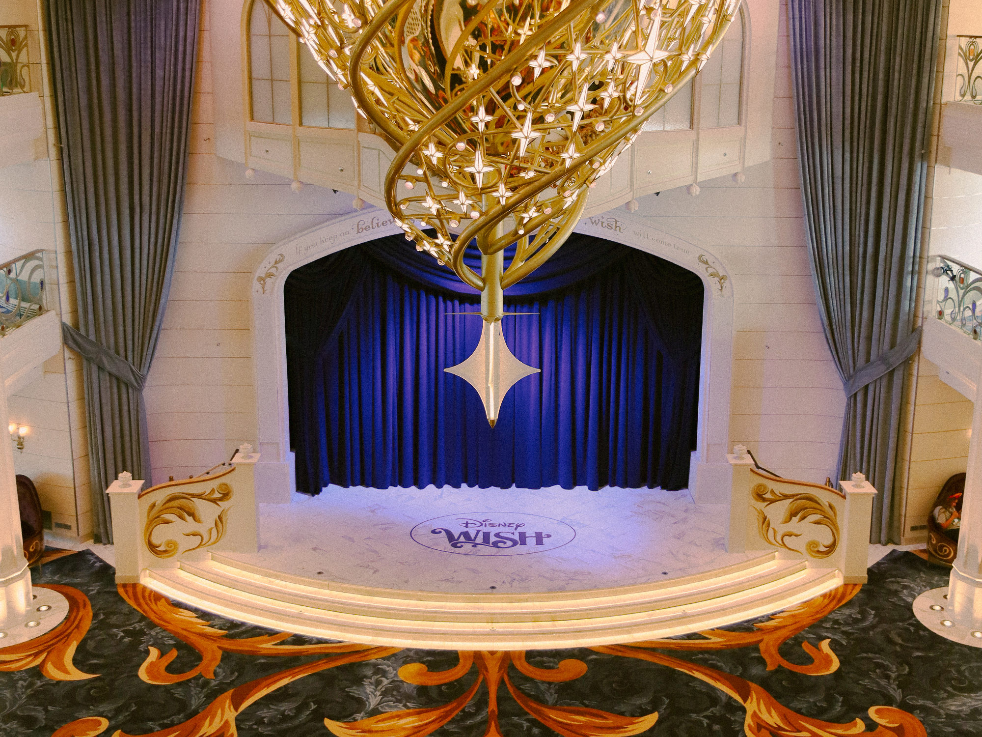 Nous sommes ENFIN montées sur le Wish, et en avons immédiatement pris PLEIN LA VUE ! Entendons-nous bien, j’aime de tout mon coeur les quatre bateaux sur lesquels nous avons navigué, mais le Wish a une touche de magie indescriptible qui six mois après notre dernière croisière de décembre est encore gravé au laser dans ma mémoire. Le concept art du Grand Hall (oui sur le Wish ça ne s’appelle plus le lobby !) ne m’avait pas totalement convaincue lors de sa sortie sur les médias Disney, mais en personne il est INCROYABLE. Son lustre pour commencer, dont je vous expliquerai les significations dans le prochain billet, son ciel étoilé, sa scène, sa moquette au motif d’une richesse fantastique, ses courbes… Bref, j’ai été immédiatement sous le charme.
