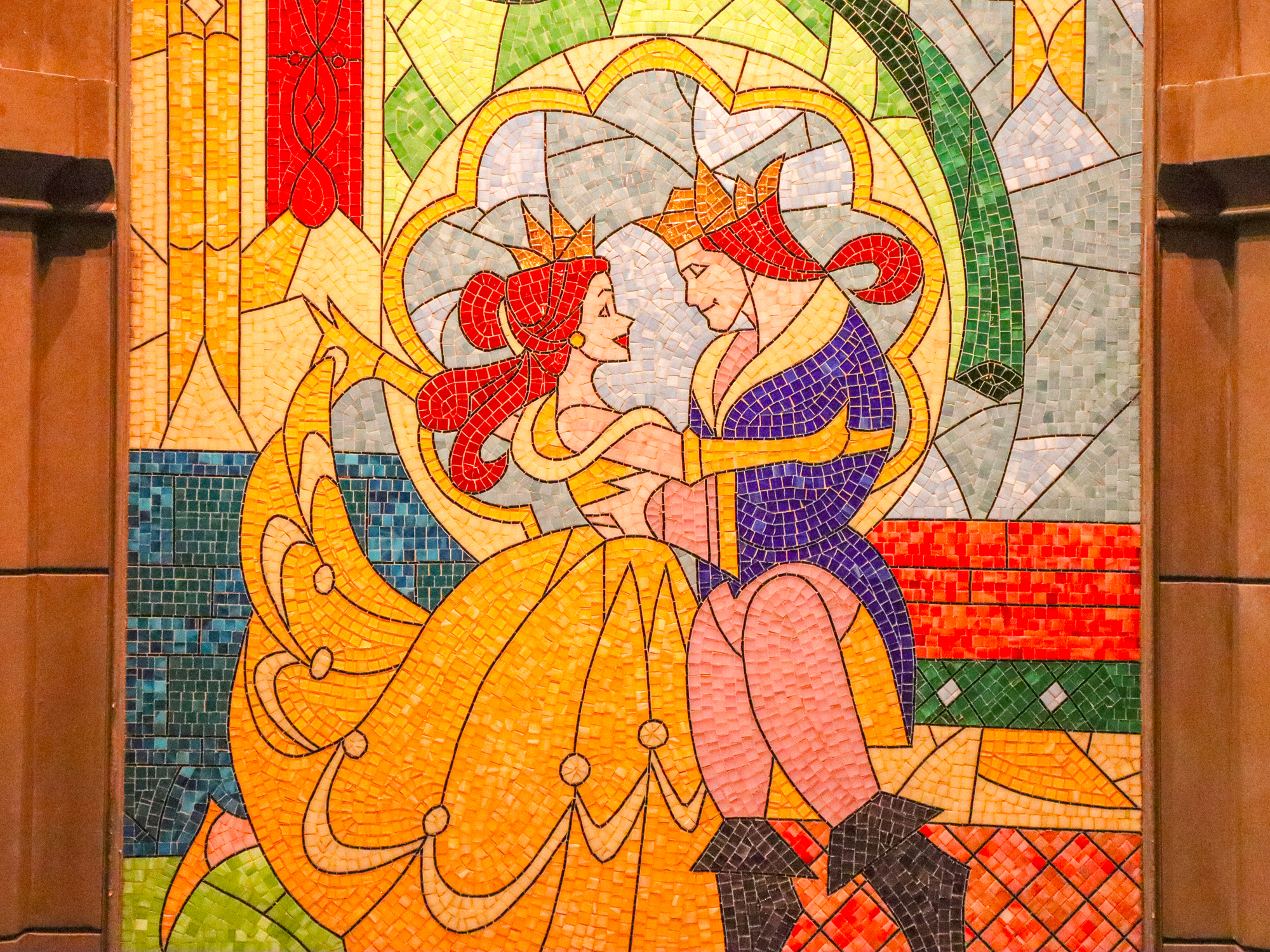 … Et pour clore la partie « food » de ce billet, je vous emmène au mythique restaurant Be Our Guest !! Cet incontournable restaurant de Fantasyland est une réplique du château de la bête dans La Belle et la Bête, et est un lieu à visiter absolument lors de votre séjour. Son offre food varie au fil des années, il servait de la nourriture de fast food inspirée de cuisine française avant la pandémie, mais pendant notre visite c’était un service à table servant bien sûr… de la nourriture d’inspiration française ! Je parlais de quelques déceptions seulement concernant la nourriture à Walt Disney World, Be Our Guest en fait tristement partie. Entendons-nous bien, le cadre est absolument fabuleux, et si c’était à refaire pour un premier séjour je n’hésiterais pas une seconde. Mais la nourriture pour nous français fut un peu en dessous de nos attentes (surtout pour le prix). Nous avons mangé des escargots, des plats en sauce type boeuf bourguignon, et pour le dessert un assortiment de pâtisserie qui nous a fait sourire puisque parmi ces derniers se trouvait un petit gâteau inspiré de « the grey stuff » dans la scène « Be Our Guest » (« la cuisine au beurre c’est la meilleure » dans la version française, rien à voir avec la choucroute). Pendant le repas nous avons vu passer la Bête de loin, on ne pouvait pas prendre de photo à ses côtés mais c’est quand même un passage remarqué et qui fait plaisir ! Petits fun facts sur ce restaurant : il est divisé en trois salles thématiques : la salle de bal (oui, celle de la mythique scène de danse sur « Tale as Old as Time« , « The Rose Gallery » – où nous avons diné, et une réplique de l’aile ouest du chateau, où le portrait déchiré de la bête est exposé sur un mur. Second fun fact, les angelots peints sur le plafond de la salle de bal sont inspirés des bébés des Imagineers qui ont travaillé à la conception du restaurant. On adore non ?