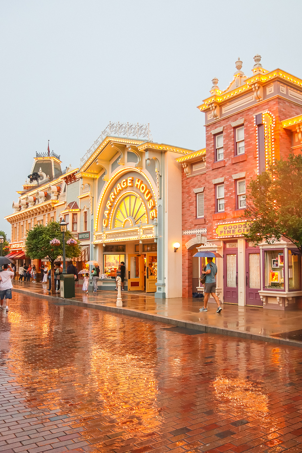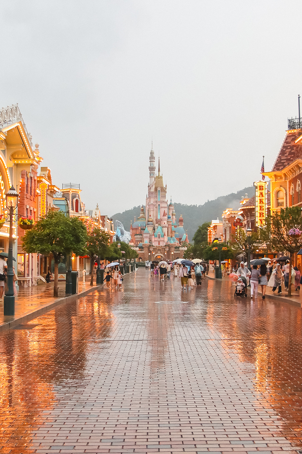 C’est en début de soirée, pendant l’heure dorée, et sous une certaine bruine que nous avons fait nos premiers pas sur Main Street U.S.A. à HKDL. Et je dois dire qu’on n’aurait pu rêver de plus parfaites conditions. Pourquoi ? Parce que tout était si joli ! Une petite brume flottait dans l’air, les lumières de Main Street se reflétaient sur le sol humide, le parc est entouré de montagnes recouvertes de végétation, lui offrant un cadre unique et tout simplement magnifique… Bref une atmosphère absolument magique enveloppait le parc ce soir-là et nous somme tous immédiatement tombés amoureux d’HKDL.
