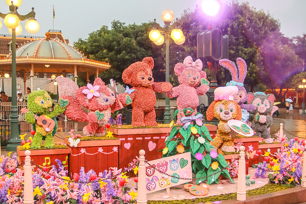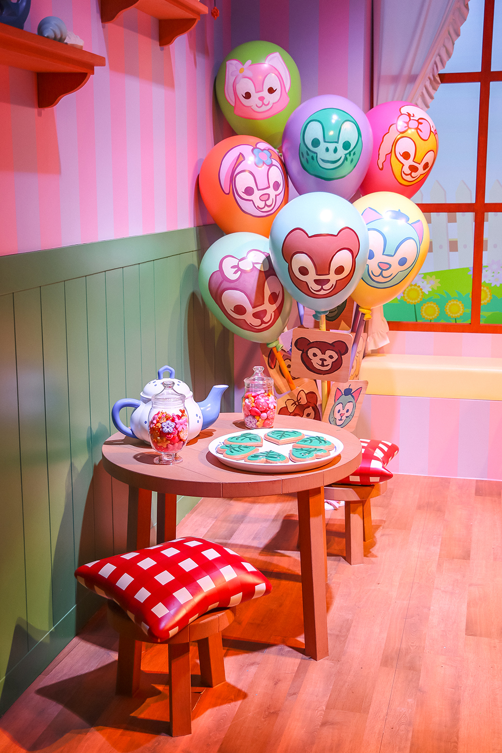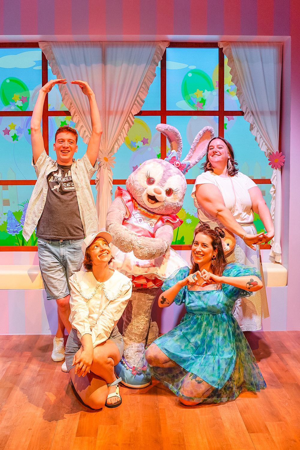 Durant notre séjour se déroulait la saison « Duffy and Friends Play Days », et les amis de Duffy étaient présents à de nombreux endroits dans le parc, notamment à l’entrée de Main Street comme vous pouvez le voir. À l’époque je n’étais pas encore tombée dans la marmite Duffy, et je n’y ai été que modérément sensible au début du séjour, mais cela a bien vite changé ! Ainsi l’une des premières attractions dont je vais parler dans ce billet est la Duffy and Friends Play House, une location de meet and greet pourvue de plusieurs loges où l’on peut rencontrer la bande à Duffy en choisissant sa file d’attente dédiée. Si j’ai décidé un peu plus tard que mon personnage favori de la bande était Cookie Ann, nous avons choisi de rencontrer Stella Lou qui est la favorite de Zouzou, afin de lui envoyer une photo souvenir pour la consoler d’avoir dû travailler pendant que nous faisions ce voyage ! La Duffy and Friends Play House propose également des petites animations interactives.
