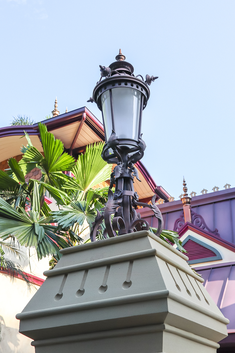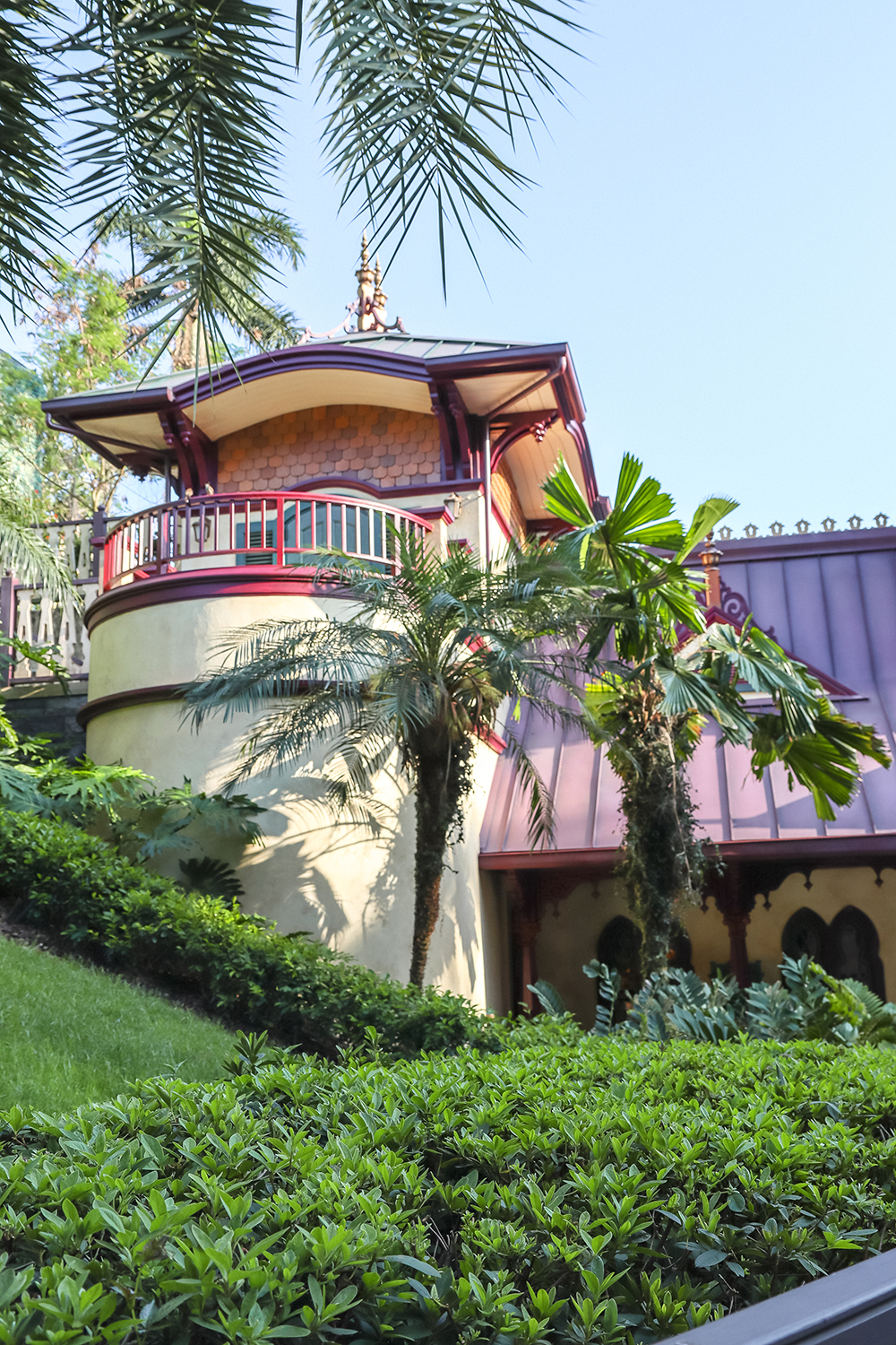 Promenons-nous maintenant du côté d’un des lands les plus remarquables d’HKDL : MYSTIC POINT. Je pense que toutes les personnes qui ont eu la chance de le visiter s’accorderont sur le fait que ce land et son attraction phare, Mystic Manor, sont absolument iconiques (et uniques). Mystic Point s’inspire de la jungle de Papouasie-Nouvelle-Guinée, et est le lieu qu’a choisi Lord Henry Mystic pour y établir une colonie, après qu’il y ait sauvé son compagnon Albert le singe d’une toile d’araignée géante. La backstory de Lord Henry Mystic est liée à la Society of Explorers and Adventurers, qui rassemble nombreux personnages originaux des parcs et attractions Disney, parmi lesquels on retrouve notamment le Dr. Albert Falls (explorateur et fondateur de la Jungle Navigation Company, liée à l’attraction The Jungle Cruise) et Harrison Hightower III (fantôme emblématique de la Tower of Terror de Tokyo DisneySea).