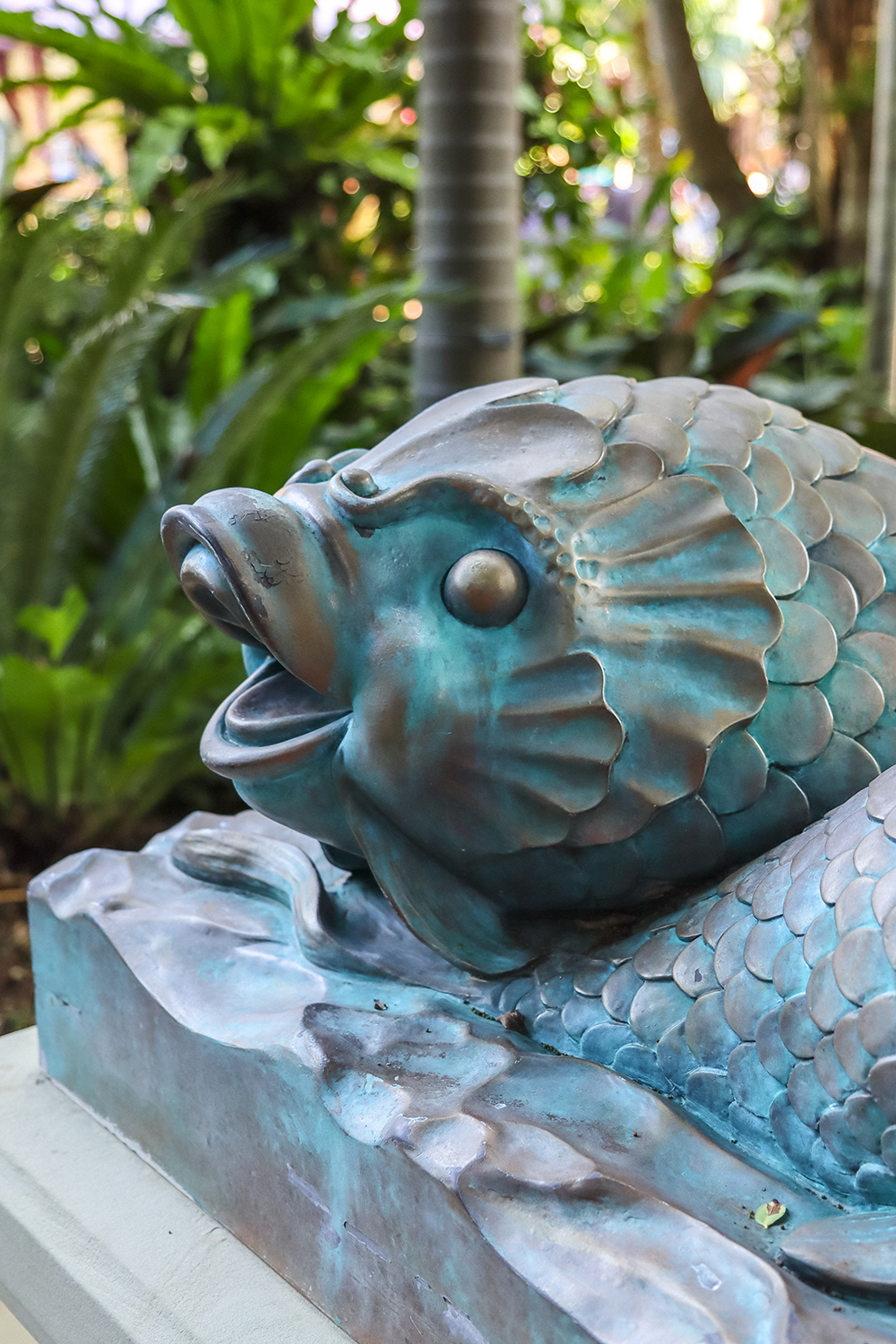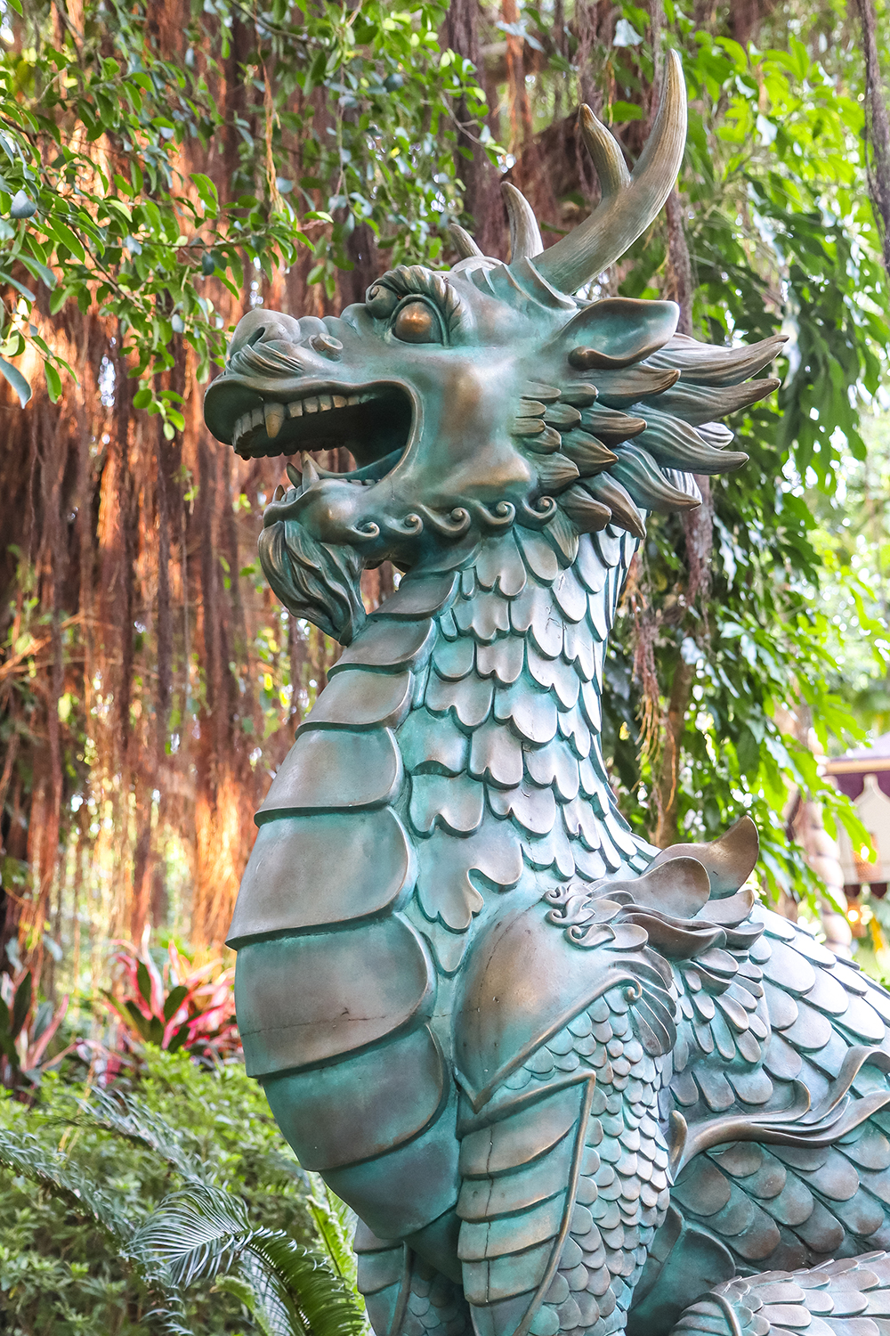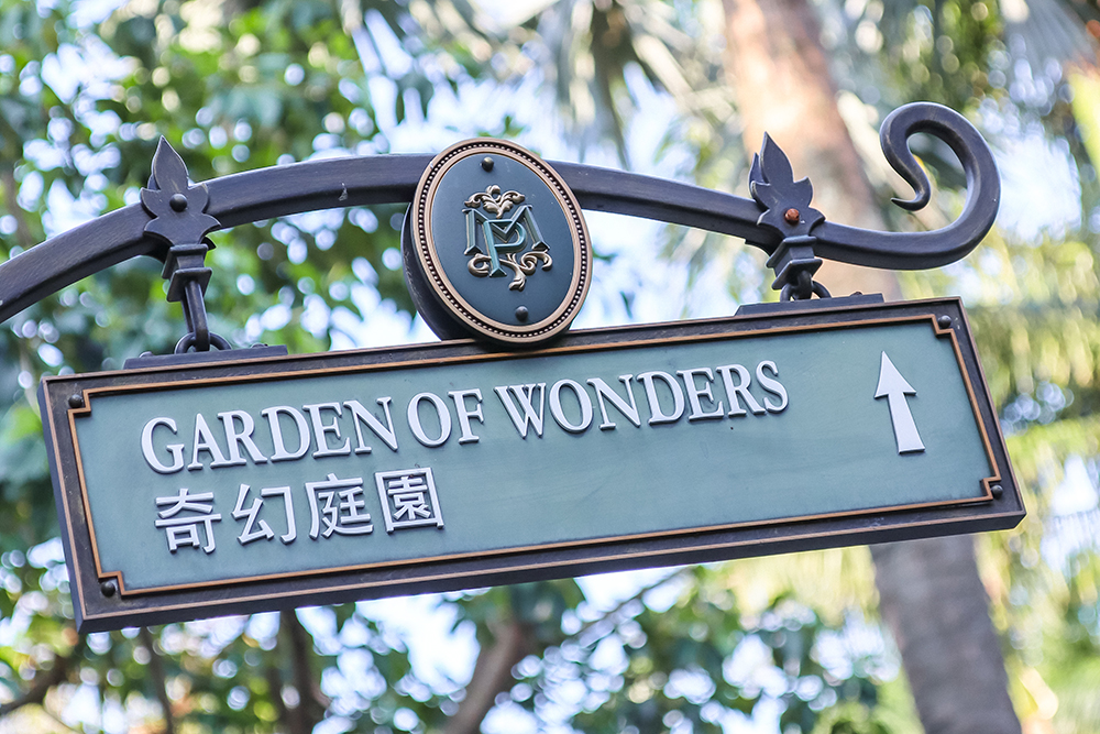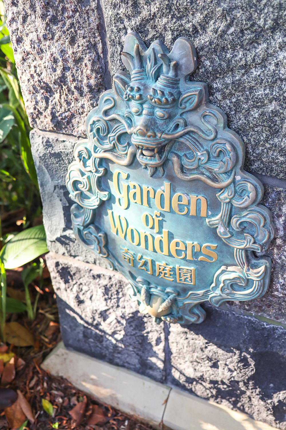 Le land Mystic Point est constitué du jardin Garden of Wonders, où nous nous sommes promenés à l’initiative de Guigui (toujours présent pour me pousser à explorer les walk throughs et autre recoins des parcs sans attractions), ainsi que de l’INCROYABLE ATTRACTION Mystic Manor – l’équivalent de Haunted Mansion / Phantom Manor local. Commençons par quelques photos du jardin, qui regorge de statues présentant des illusions d’optique.