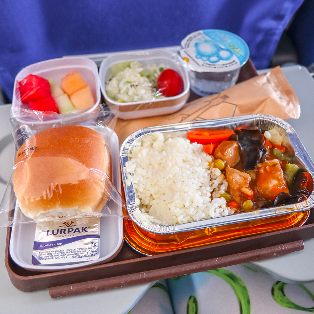 … embarquement sitôt effectué… on nous a servi un lunch ! Et un lunch plutôt bon pour de la cuisine d’avion. On ne s’y attendait pas pour un vol de seulement trois heures, mais on n’a pas boudé nos plateaux, et avons donc déjeuné deux fois à une heure d’intervalle héhé.